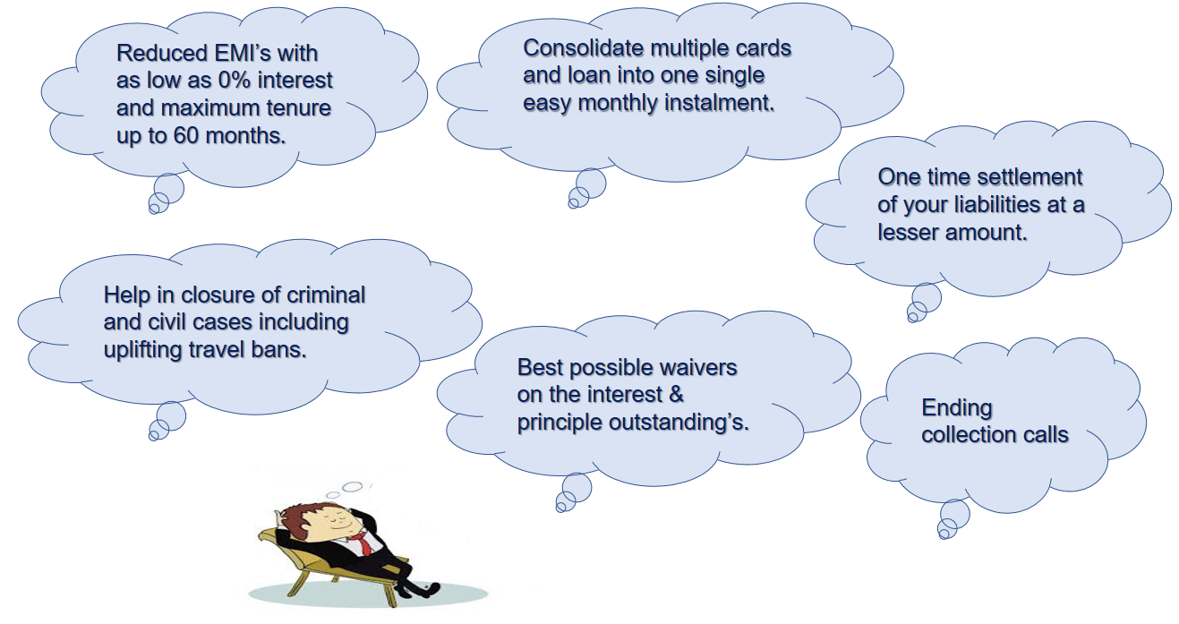 If you’re struggling to pay back a Credit Card and are tired of paying high interest to your banks in the form of minimum dues, then debt restructuring is the best suited option for you. We’ll review your existing debt/liabilities, work out more favorable repayment terms with your existing banks and reduce your monthly installments.